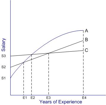 Each of the curve above plots salary at a given point of time in one’s career. For simplicity, I have used straight line progressions for salary, actual progress will be a more complex curve, but straight line will prove the point. A, B, and C are various different types of salary progressions one can have in his/her life.