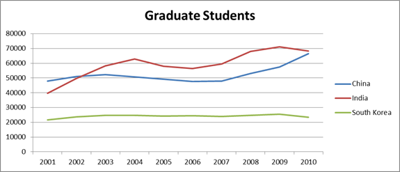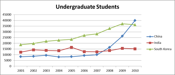 - South Korea dominated (by a big margin) in terms of undergraduate students till 2007, when China started accelerating and finally caught up this year. South Korea has been flat, and low in terms of graduate students.